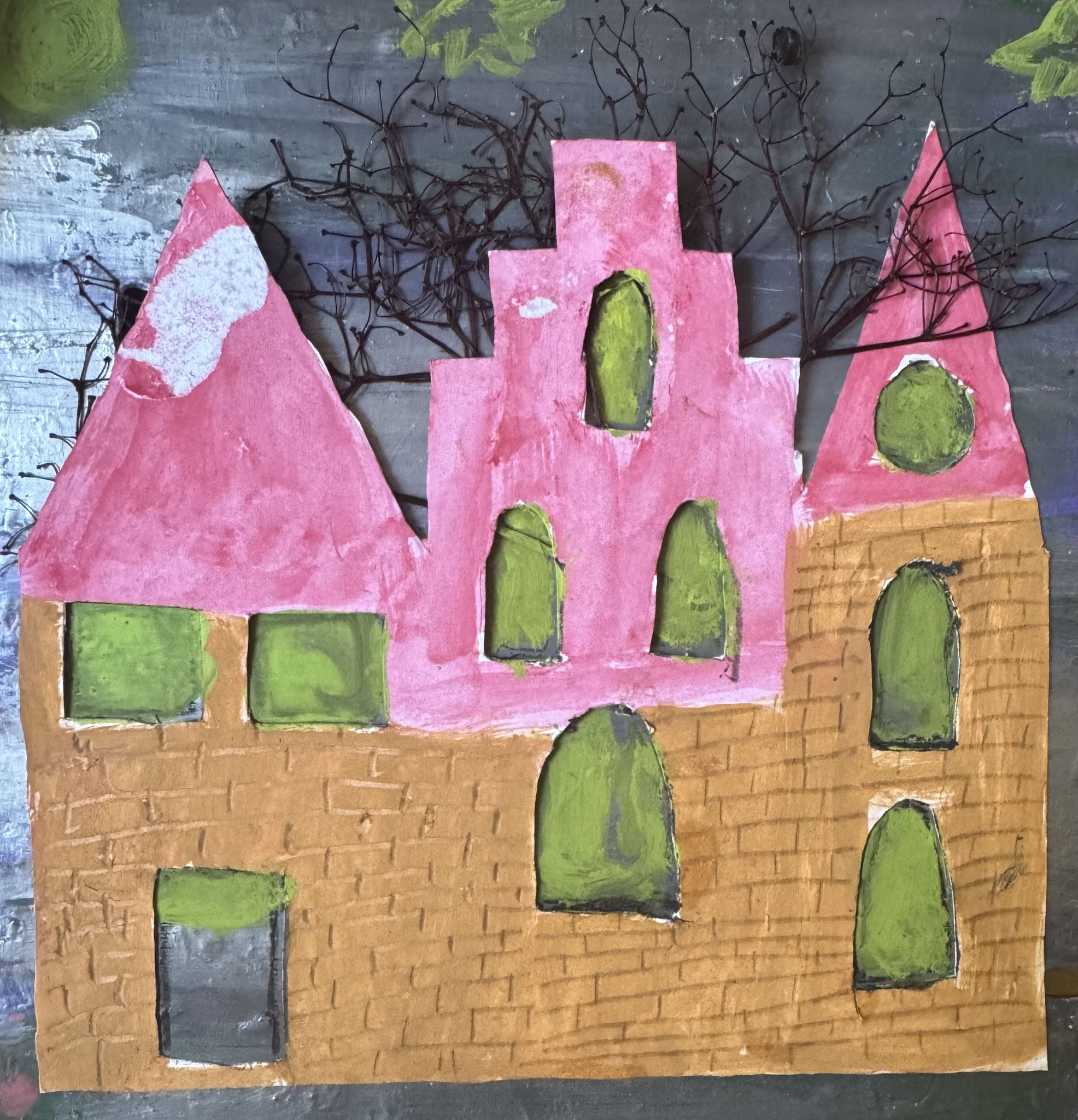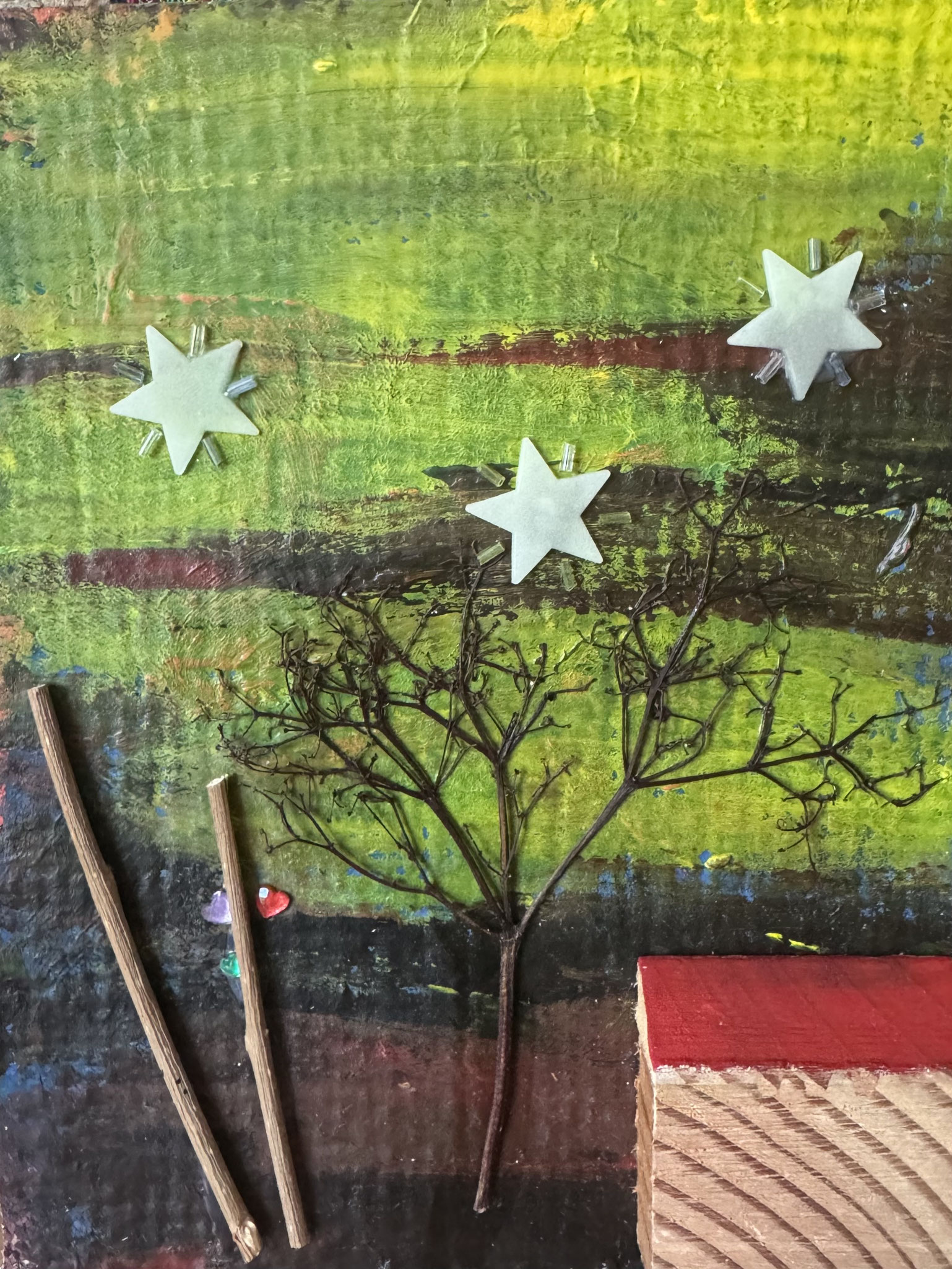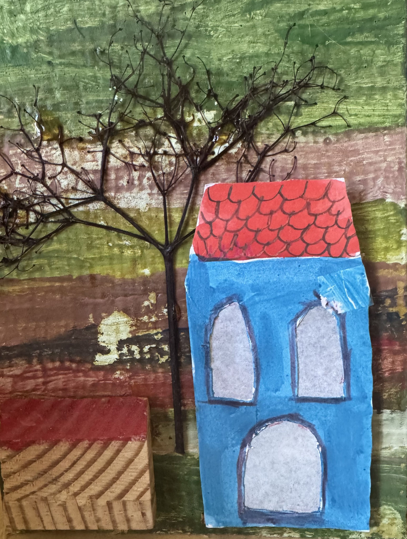 Ende Januar sind im Offenen Atelier im Grünen Haus viele Collagen in Postkartenformat entstanden.Diese hier ist von mir. Ich finde sie äußerst aktuell, denn das Leben erscheint mir in vielerlei Hinsicht gerade sehr surreal. Das Loch in der Wand mit dem kleinen Himmelsausschnitt hat mich deshalb sehr inspiriert.