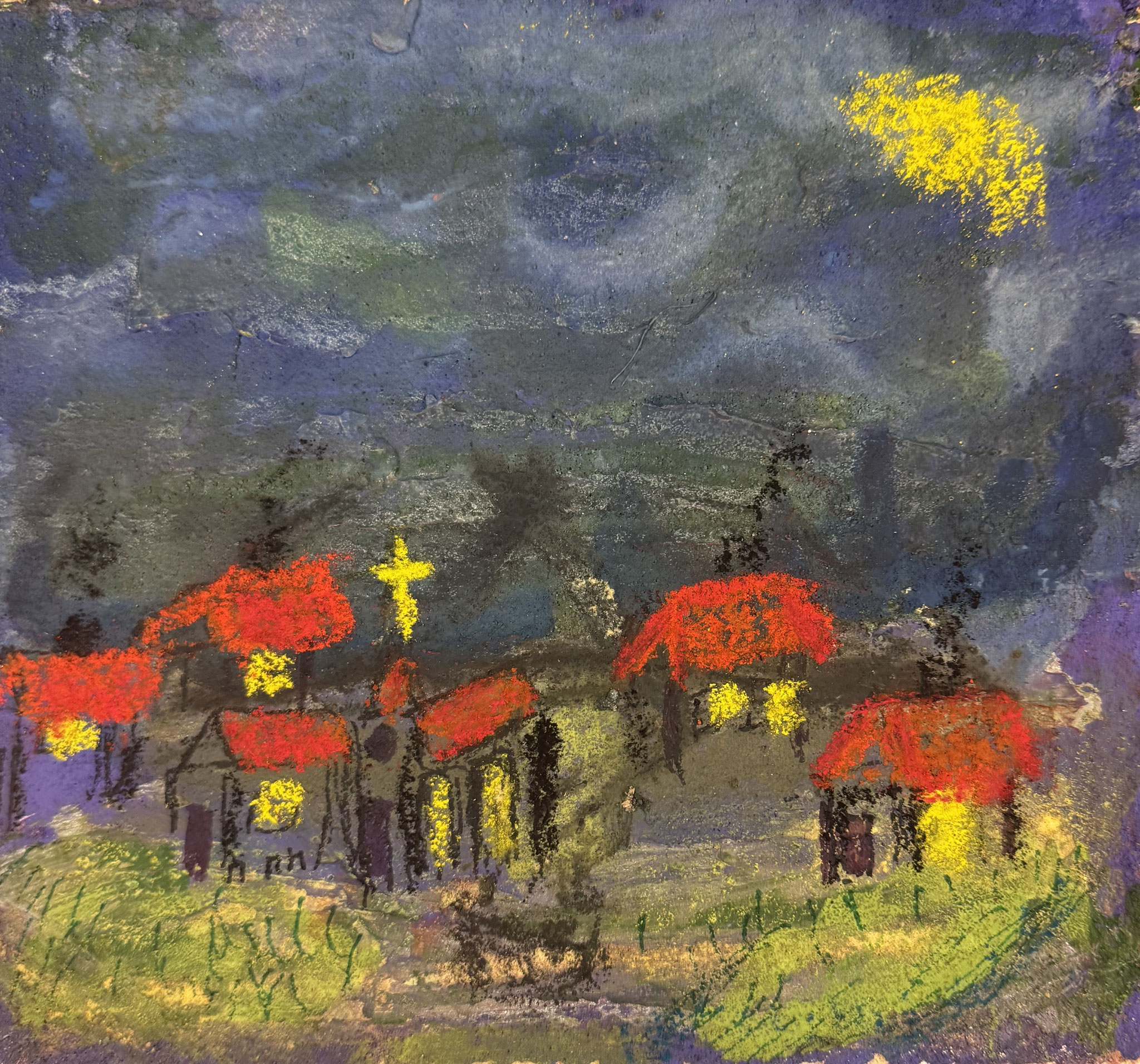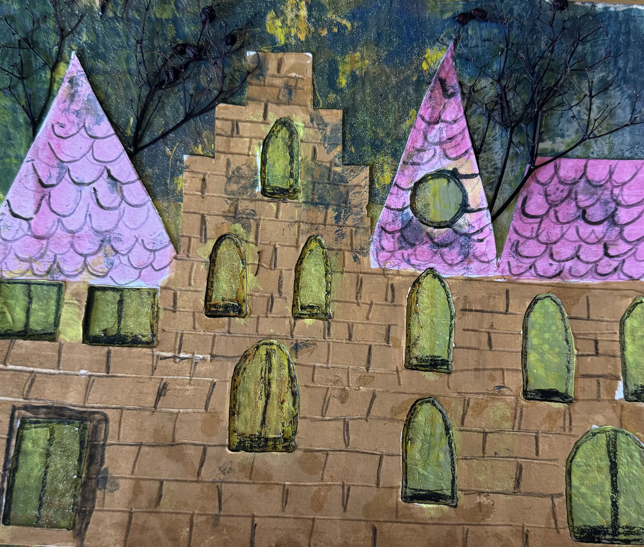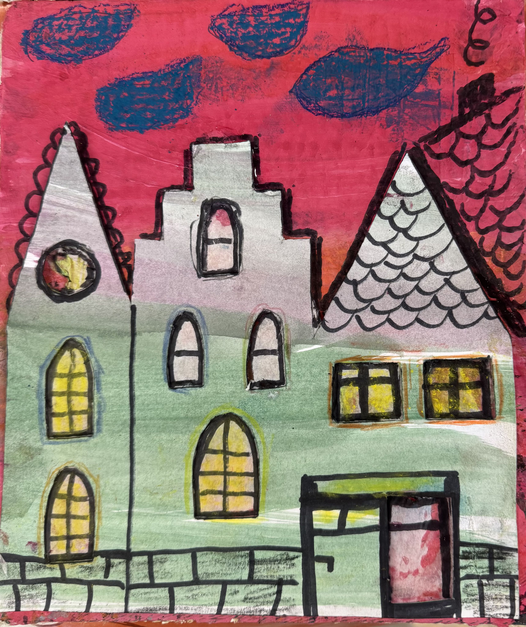 Ende Januar sind im Offenen Atelier im Grünen Haus viele Collagen in Postkartenformat entstanden.Diese hier ist von mir. Ich finde sie äußerst aktuell, denn das Leben erscheint mir in vielerlei Hinsicht gerade sehr surreal. Das Loch in der Wand mit dem kleinen Himmelsausschnitt hat mich deshalb sehr inspiriert.